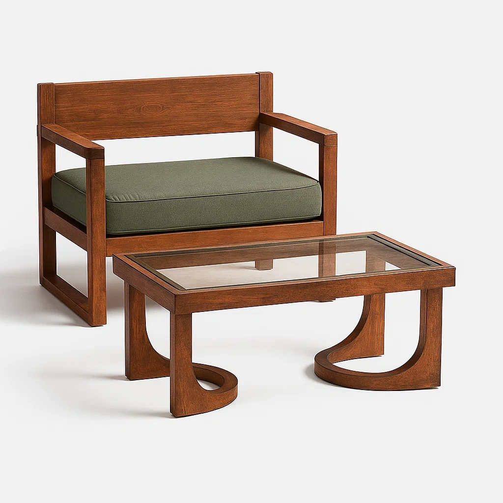 Canapé d’angle en bois avec coussins verts et table basse en verre
