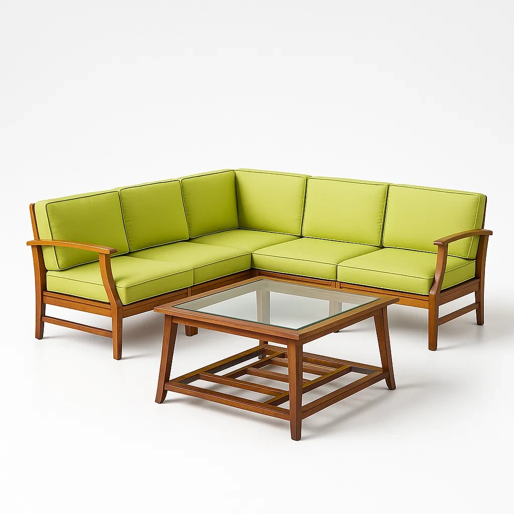 Canapé d’angle en bois avec coussins en tissu vert et table basse en verre