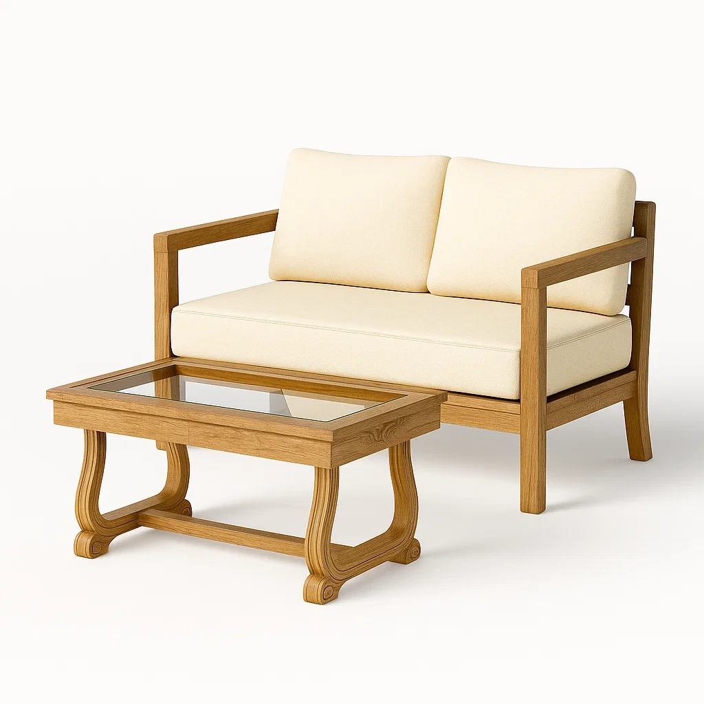 Salon de réception avec canapé 2 places en bois et tissu et table basse en verre