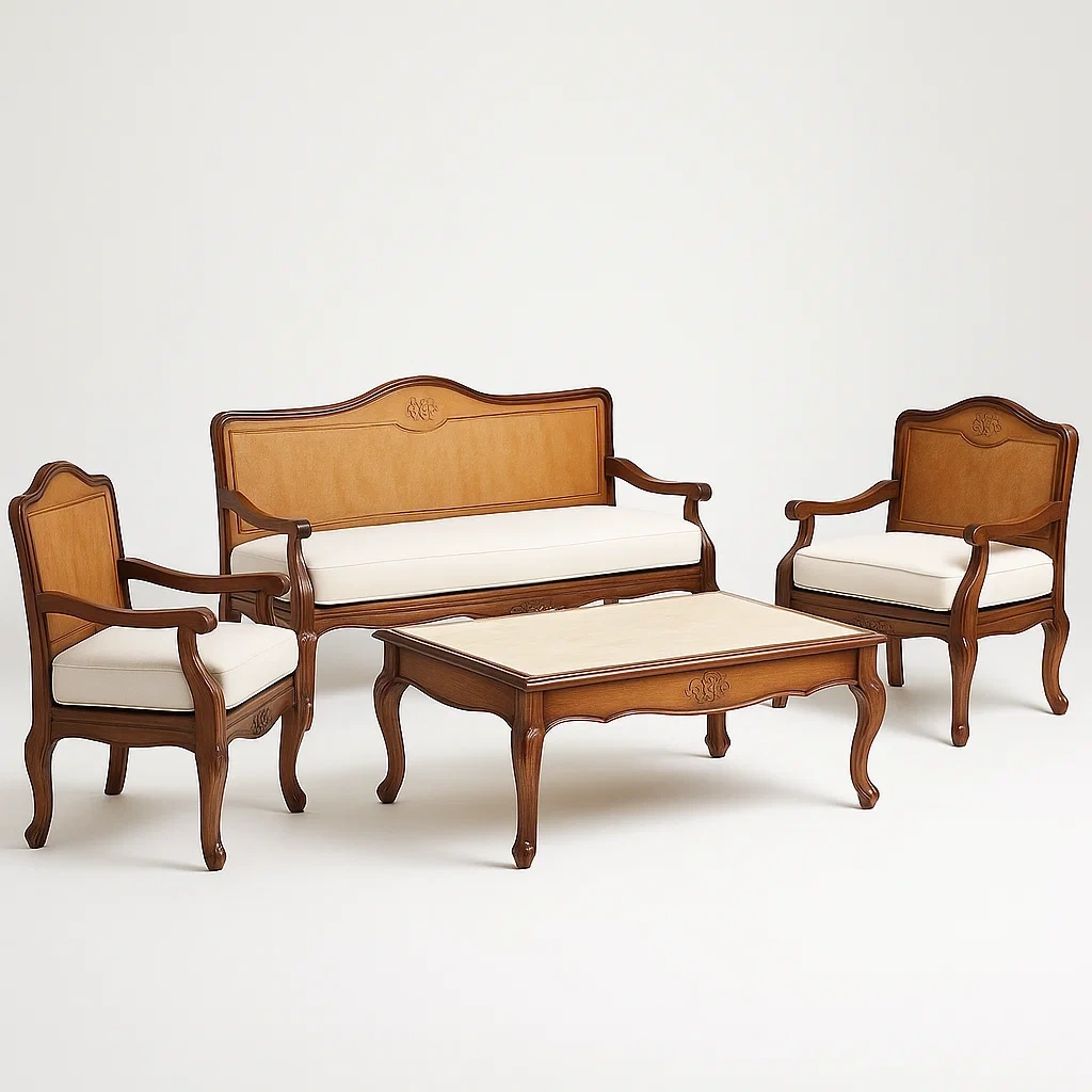Salon de réception en bois avec canapé et fauteuils en tissu beige