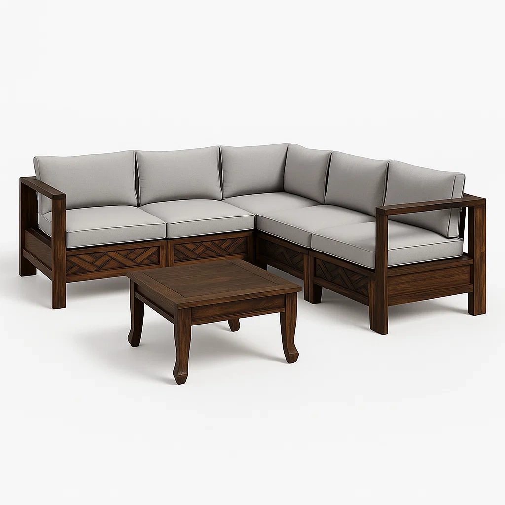Canapé d’angle en bois avec coussins en polyester marron et table basse