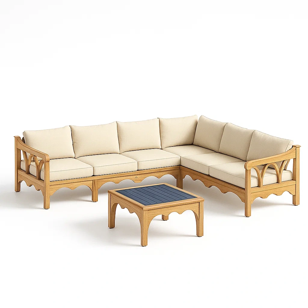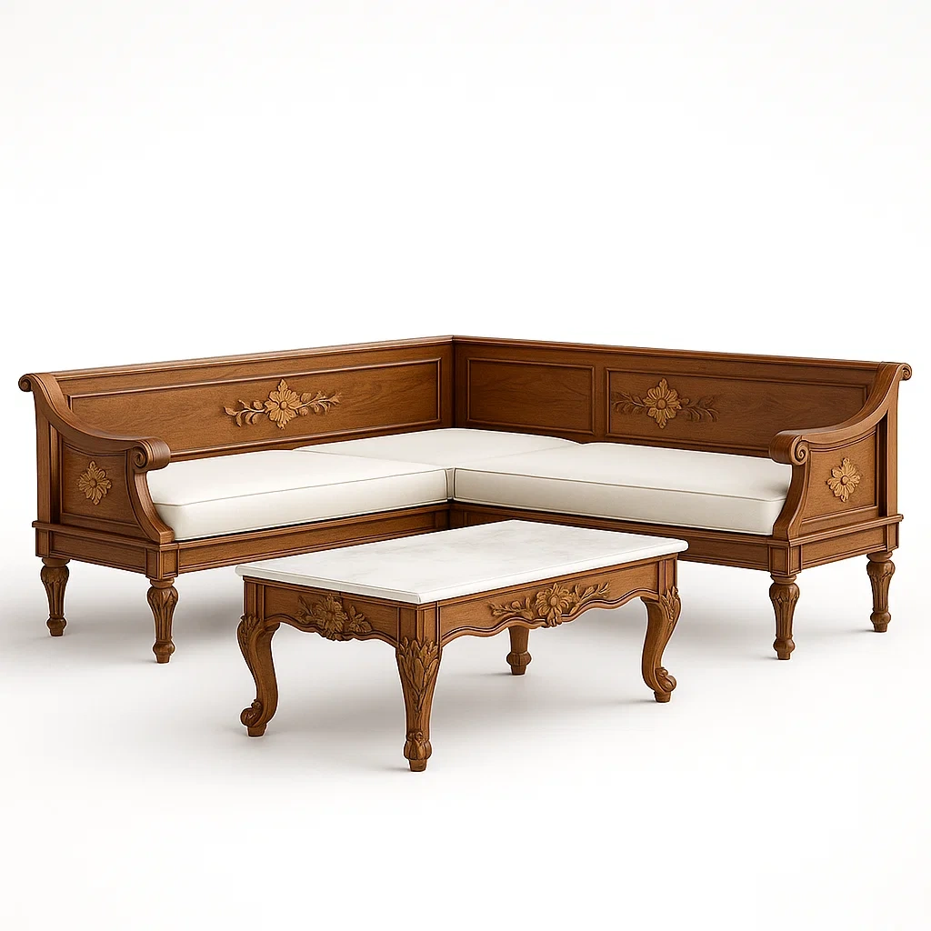 Canapé d’angle en bois avec coussins en tissu beige et table basse en marbre