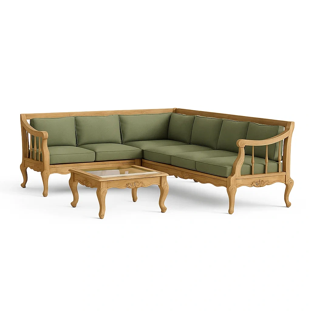 Canapé d’angle en bois avec coussins vert olive et table basse en verre