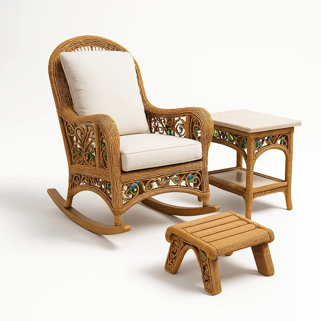 Liste des produits : Fauteuil à bascule x1, repose-pieds x1, table d'appoint x1