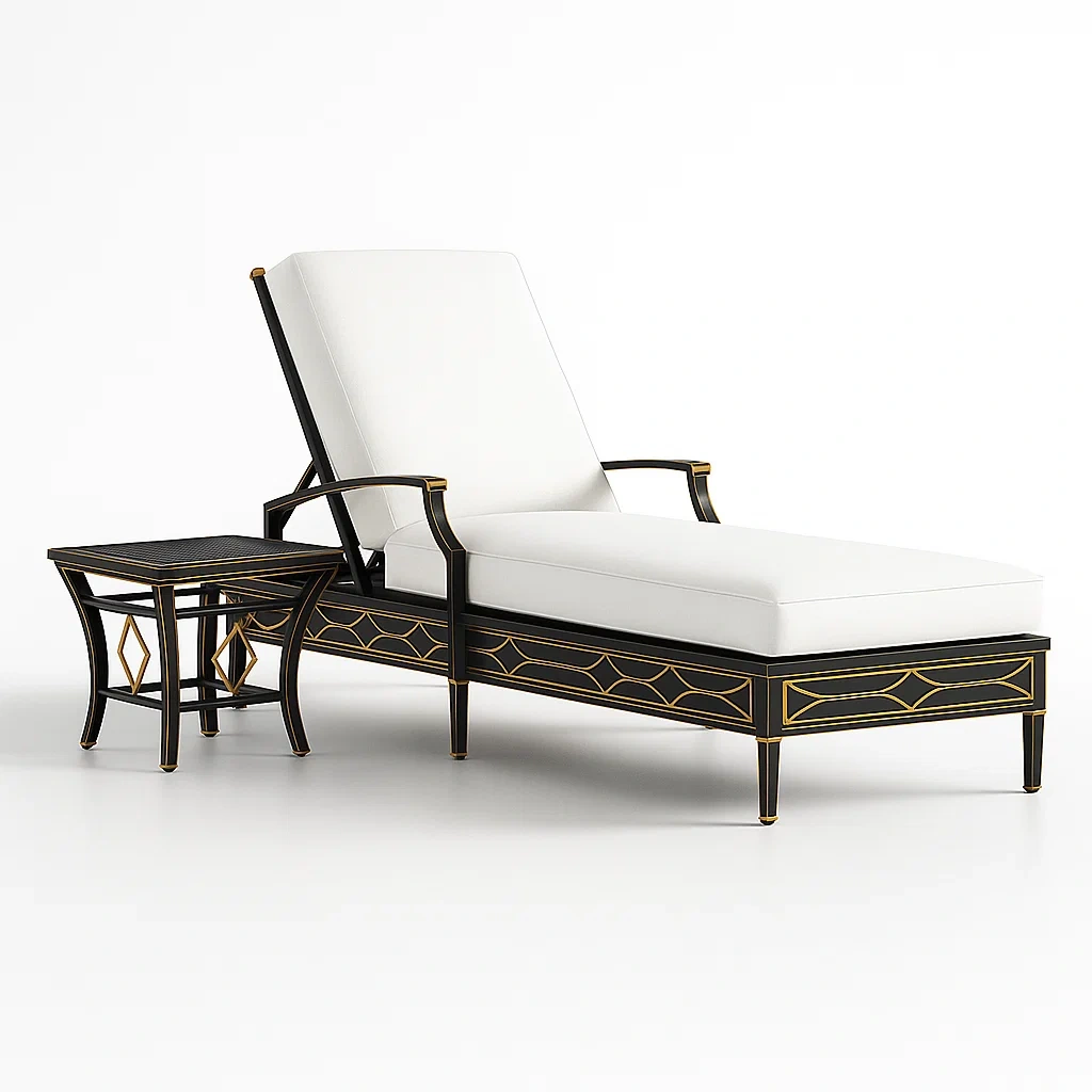 Dimensions : Chaise longue : longueur 190 cm, largeur 70 cm, hauteur 35 cm. Table : longueur 45 cm, largeur 45 cm, hauteur 45 cm.
