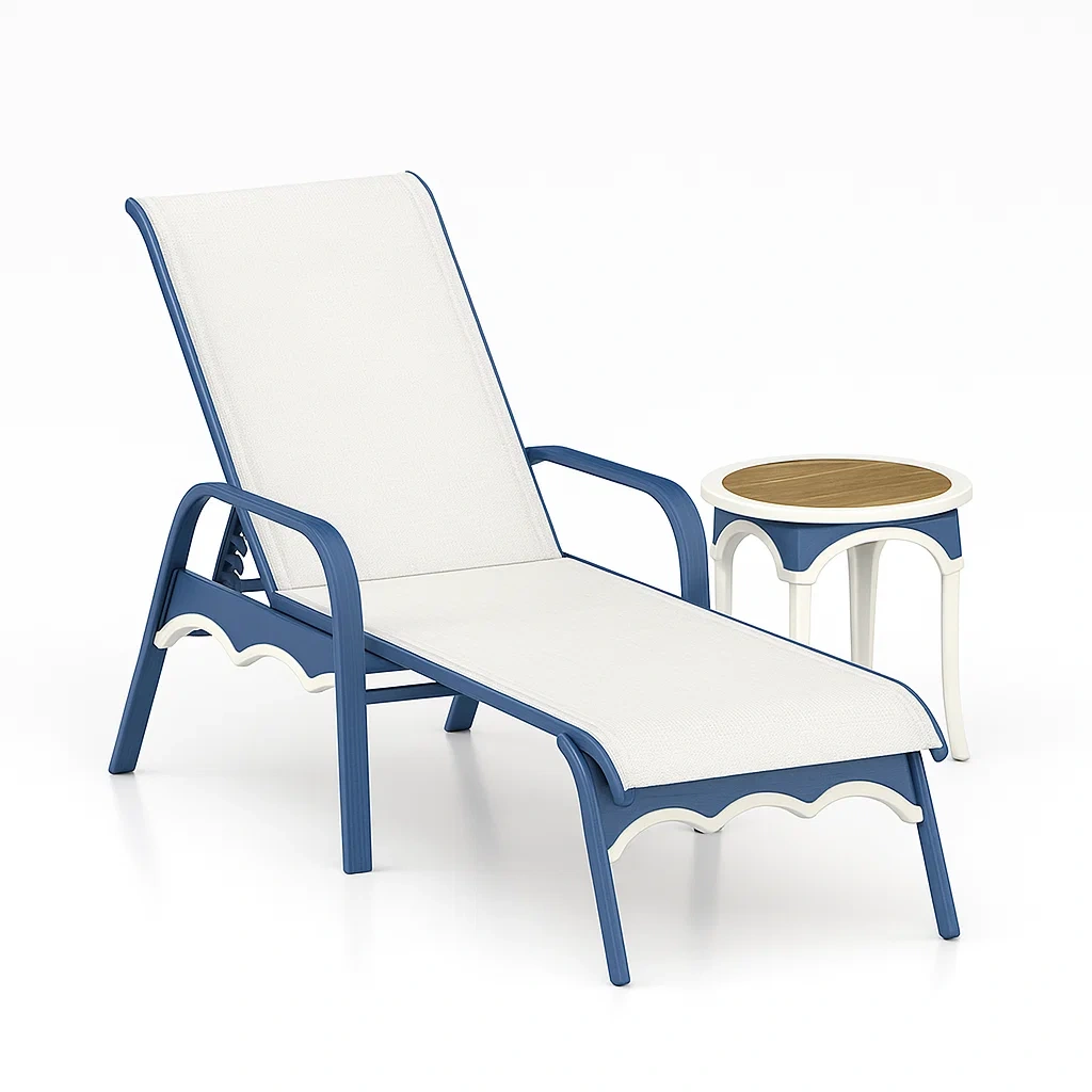 La table d'appoint est dotée d'une surface en bois. La chaise longue peut être ajustée en plusieurs positions pour.