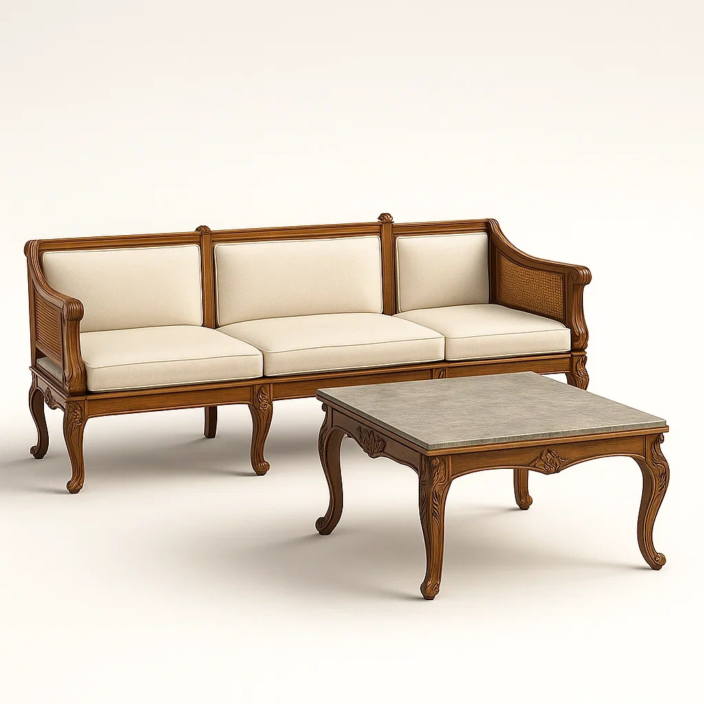 Salon de réception avec canapé trois places en bois et table basse en marbre, beige et marron